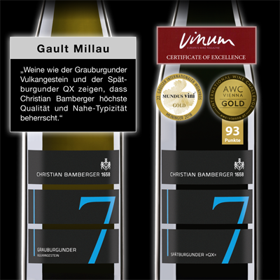Die resultierenden Weine sorgen schnell für Furore und verhelfen Christian Bamberger zur Falstaff -Nominierung „Newcomer des Jahres“. Besondere Leidenschaft widmet er seit einem Studienjahr in Kalifornien auch den Rotweinen. Mit Cabernet-dominierten Cuvées und Spätburgundern belegt Christian Bamberger regelmäßig Spitzenplätze bei Rotweinwettbewerben. Drei vom Vulkangestein geprägte Weißweine und vier kraftvolle „rocking Reds made in Germany“ gilt es während einer aromatischen Entdeckungsreise im Zeichen der 7 zu entdecken!